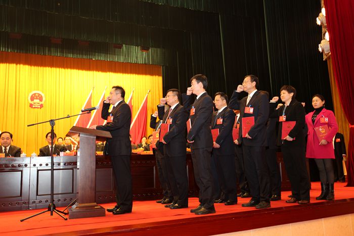 1月19日,市第十四届人大第五次会议新当选的12名国家公职人员,面朝鲜艳的五星红旗,左手抚按《中华人民共和国宪法》,右手举拳,向宪法许下庄严的承诺。