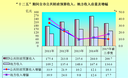 3、经济质量稳步提高。伴随着国民经济的稳步发展,株洲财政迅速发展壮大。2009年,全市财政总收入首次跨过百亿大关,达到100.3亿元,成为全省第二个财政总收入突破百亿的市州。2014年,全市公共财政预算收入264亿元,为2010年的2倍,占GDP比重为12.2%,较2010年提高2个百分点,2011-2014年年均增长19.2%;地方收入167.4亿元,为2010年的2.1倍, 2011-2014年年均增长21%;地方收入占财政总收入的比重由2010年的59.6%提高到2014年的63.4%,地方可用财力逐年提高。2014年全市公共财政预算支出292亿元,为2010年的1.86倍, 2011-2014年年均增长16.8%。2015年前三季度,全市公共预算财政收入与地方收入分别为200.7亿元和134.6亿元,分别增长10.3%和17.7%;公共财政预算支出241.9亿元,增长24.1%。财政收支的快速增长标志着株洲经济质量的显著提高,地方政府提供公共服务和改善民生的财力得到有力保障,较好地促进了地方经济和社会事业的发展。
