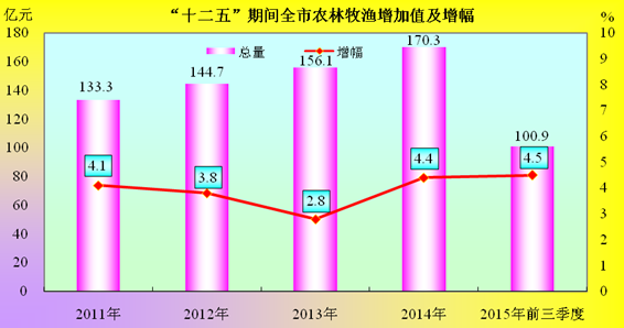 1、农业现代化逐步形成。“十二五”期间,株洲市传统农业和现代农业得到全面发展。第一产业增加值从2011年的133.3亿元增加到2014年的170.3亿元,年均增长3.8%,2015年前三季度第一产业增加值为100.9亿元,增长4.5%。随着农业现代化的发展,全市农业生产力水平得到进一步提高,全市农业机械总动力从2010年的243.5万千瓦提升到2014年的313.6万千瓦,年均增长4.8%。全市农业正在由粮猪型、分散型、单一化向高效型、集约化、多元化方向转变,新农村建设成效明显,农业现代化逐步形成。