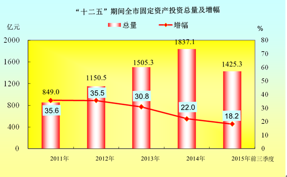 一是投资规模快速扩张。“十二五”期间,株洲芦淞服饰物流中心项目、中国五矿精密工具园等相继落户株洲;新旗滨玻璃搬迁等项目建设进展顺利;神龙城、湘江风光带、大功率半导体IGBT产业化、中航动力航空工业零部件、北汽株洲分公司一工厂二期等一批重大项目相继竣工投产,有效拉动了投资规模持续扩大,为经济增长注入了强劲动力。2011年-2014年,全市固定资产投资连续跨越800亿、1000亿、1500亿、1800亿元大关。2012年,株洲市固定资产投资首破千亿大关,高达1150.5亿元,成为全省五个固定资产投资突破千亿的市州之一。2014年达到1837亿元,为2010年的2.3倍,四年累计投资达5342亿元,年均增长30.9%。2015年前三季度,全市固定资产投资总额1425.3亿元,居全省第4位,增长18.2%。