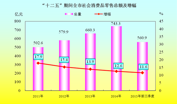 二是消费市场持续活跃。随着市场经济体制的确立,多种经济成分、多条流通渠道、多种经营形式并存的消费市场体系日渐形成,株洲商品经济也迅速发展起来,内需对经济增长的拉动作用逐步增强。2011年-2014年,全市消费品零售总额连续跨越500亿、600亿和700亿元大关,2014年达到749.2亿元,增长12.6%,比2010年增加318.2亿元,四年累计消费达2502.8亿元,年均增长14.8%。网络集中交易平台建设不断完善,“生产厂家—互联网—消费者”的新兴业态消费快速增长,2014年阿里巴巴株洲产业带年销售额突破10亿元,进入全国产业带前五位。2015年前三季度,全市全社会消费品零售总额560.9亿元,增长11.6%。